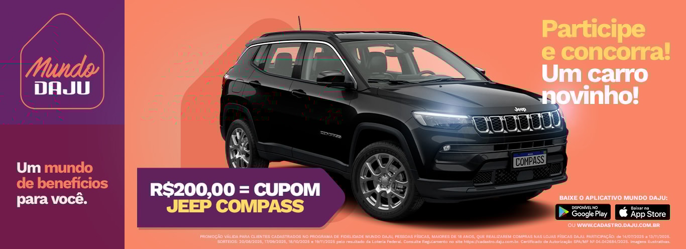 A cada R$ 200 em compras nas lojas físicas Daju, você recebe um cupom para concorrer ao sorteio de um Jeep Compass.