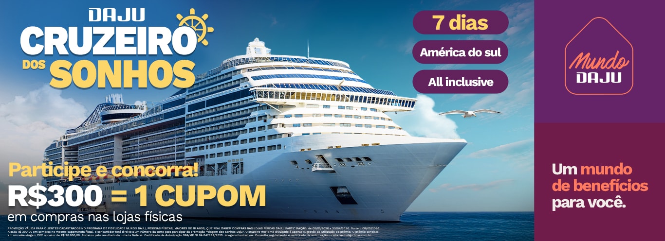 De 05/01/2026 a 30/04/2026, comprando nas lojas físicas Daju, a cada R$ 300,00 em compras no mesmo cupom fiscal, você recebe 1 número da sorte para concorrer aos prêmios da campanha Viagem dos Sonhos Daju.